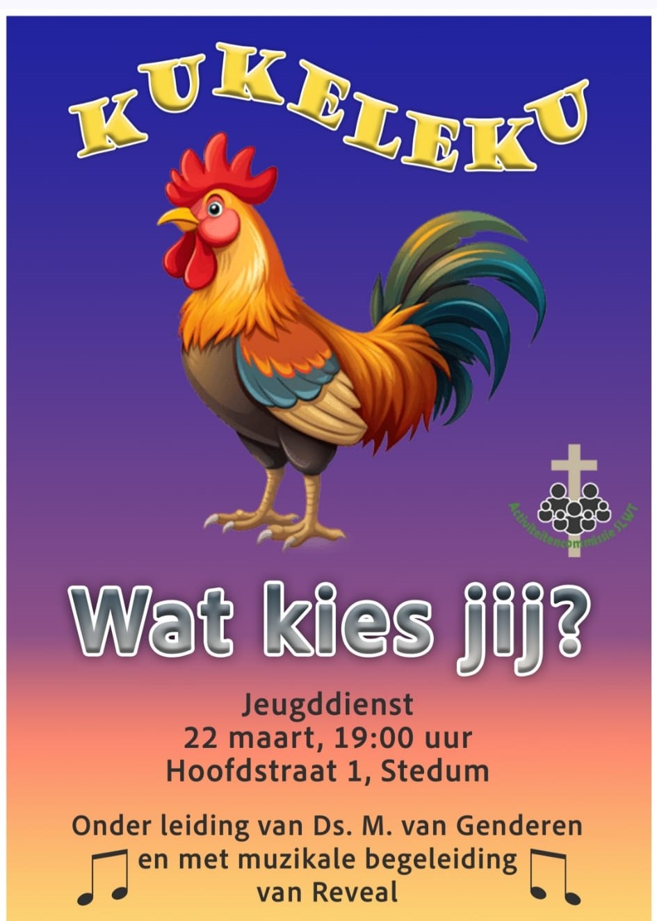 D .V. zondagavond 22 maart 2026 om 19:00 uur hopen we een jeugddienst te organiseren in de Bartholomeüskerk (Hoofdstraat 1) in Stedum. In deze dienst hoopt ds. Martijn van Genderen voor te gaan.